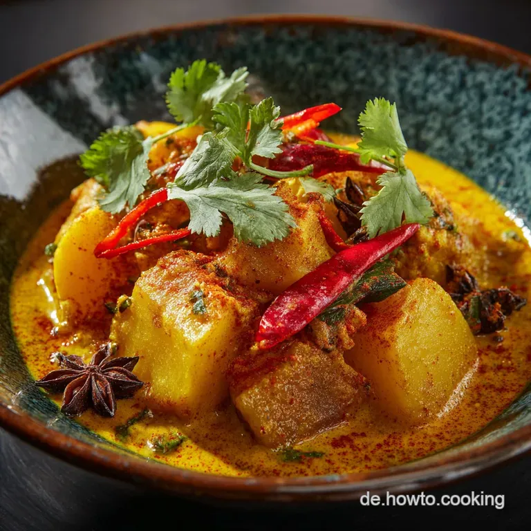 Basierend auf den verwendeten Vollfett Kokosmilch- und Kartoffelmengen beträgt der geschätzte Kaloriengehalt pro großzügiger Portion (ohne Beilagen wie Reis) etwa 380 bis 420 kcal. Das Gericht ist relativ reich an Kohlenhydraten (ca.