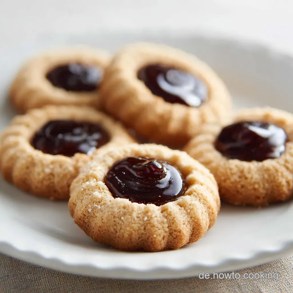 Koch Tipp: Wenn du die Marmelade erst nach dem Backen einfüllst, bleibt sie glänzend und sieht aus wie flüssige Juwelen. In diesem Fall backst du die Teigrohlinge mit Mulde leer und füllst das warme Gelee in die noch heißen Plätzchen.