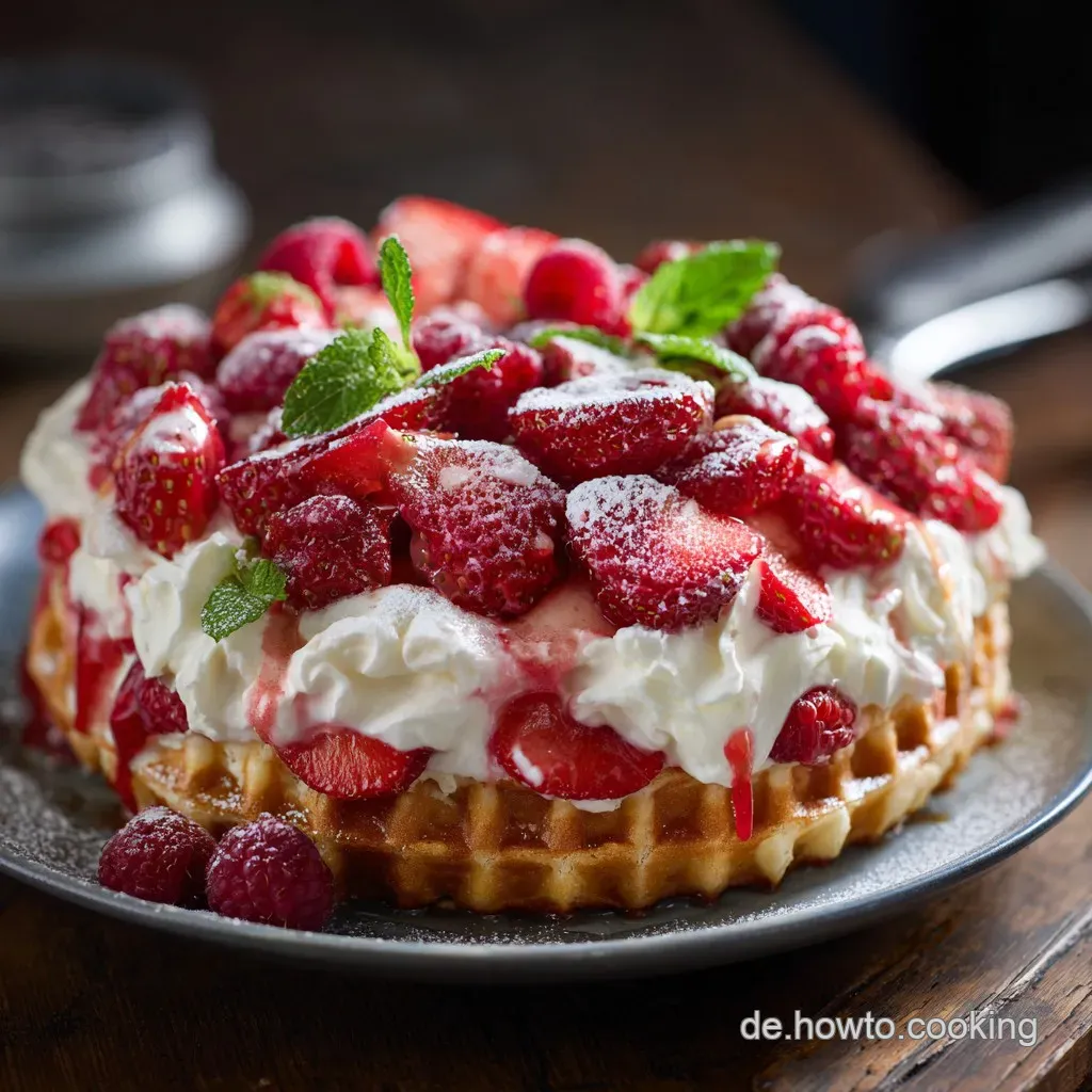 - Früchte einlegen: Belege die Creme gleichmäßig mit der Hälfte der geschnittenen Erdbeeren und einem Teil der Himbeeren. Schichte erneut Waffeln, leicht befeuchtet.