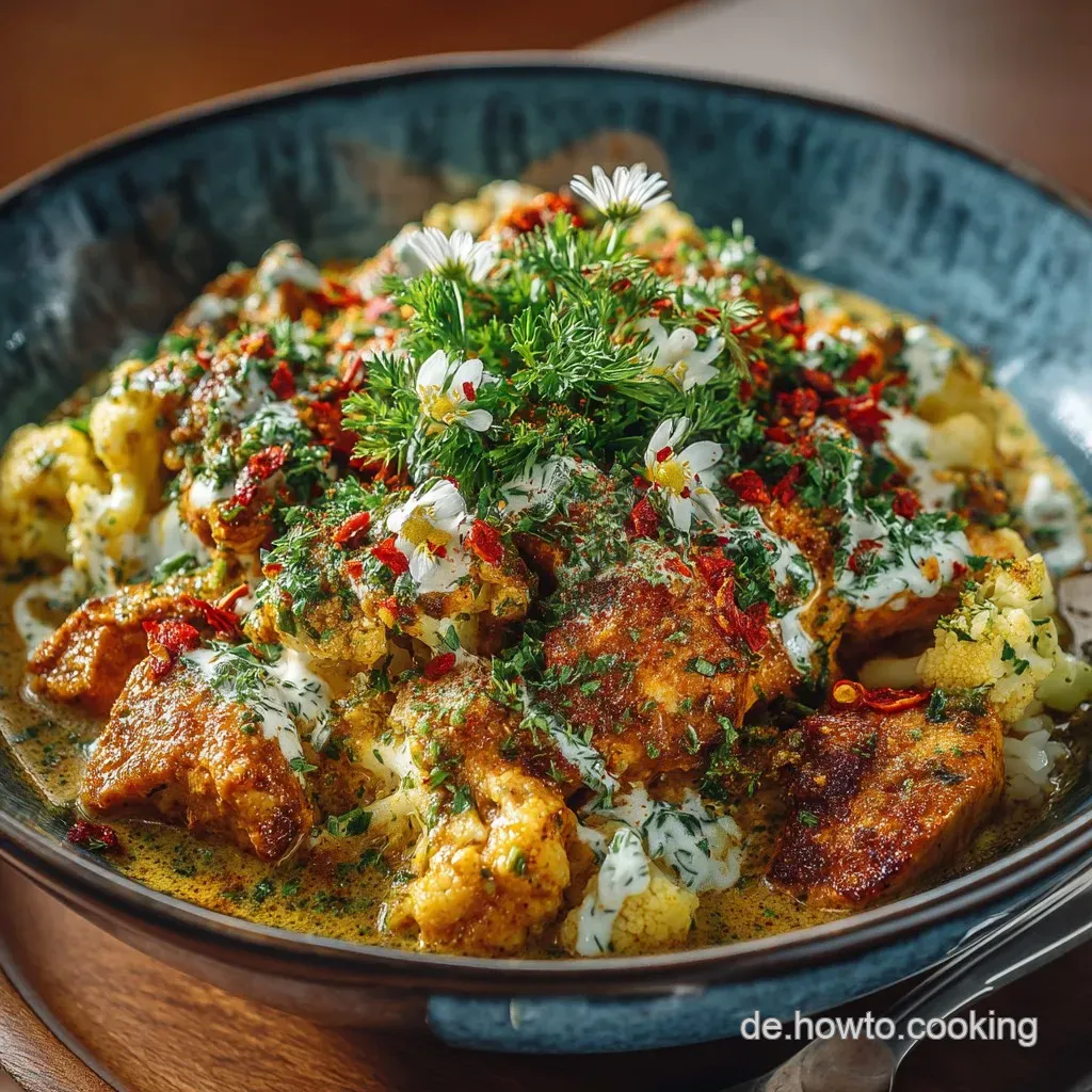 Geben Sie die pürierte Sauce zurück in den Topf. Jetzt kommen die Veganes Butter Chicken mit Kichererbsen hinzu. Lassen Sie die Sauce bei niedriger Hitze sanft köcheln. Der letzte aromatische Schliff erfolgt durch Kasuri Methi – die getrockneten Bockshornkleeblätter. Zerreiben Sie diese unbedingt zwischen Ihren Handflächen, bevor Sie sie einrühren; dies setzt das charakteristische, leicht süßliche Aroma frei. Kurz bevor Sie servieren, heben Sie vorsichtig das geröstete Tofu-Blumenkohl-Duo unter. Lassen Sie das Ganze noch fünf Minuten ziehen.